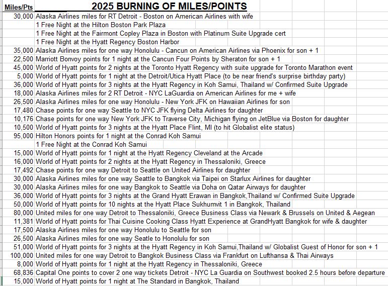 It is time for the annual post How I Burned 1,893,248 Miles and Points in 2025. I am including some photos along with some advice and feedback as always of course. See you on Friday with the usual blog post featuring a collection of curated links along with my commentary, thank you for reading my blog. You can skip this post and return Friday if you are not into this crazy hobby.